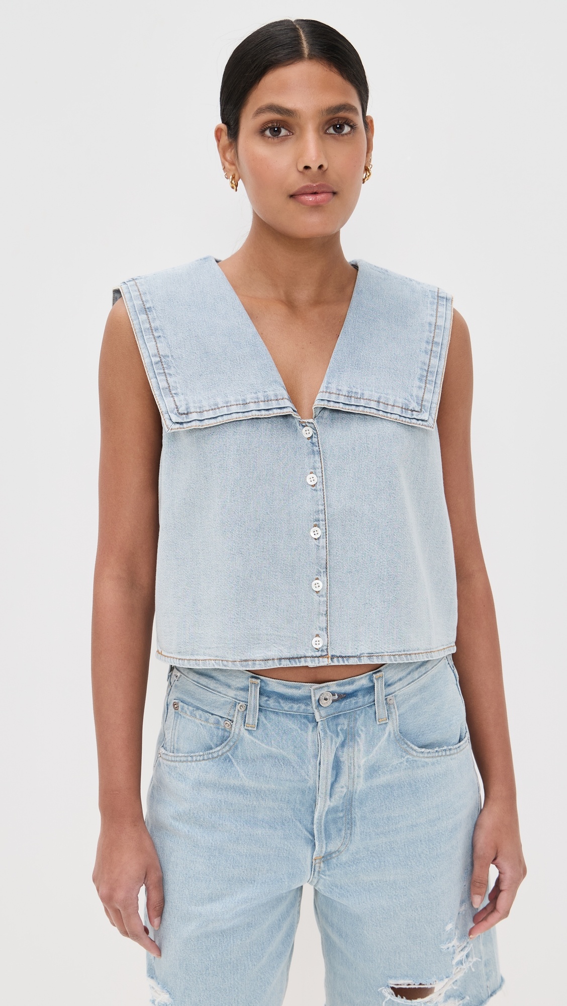 - Fabric: Lightweight, non-stretch denim - Collared neck - Sleeveless - Button placket - Shell: 100% cotton - Wash cold - Imported, China Style #FRAME32916