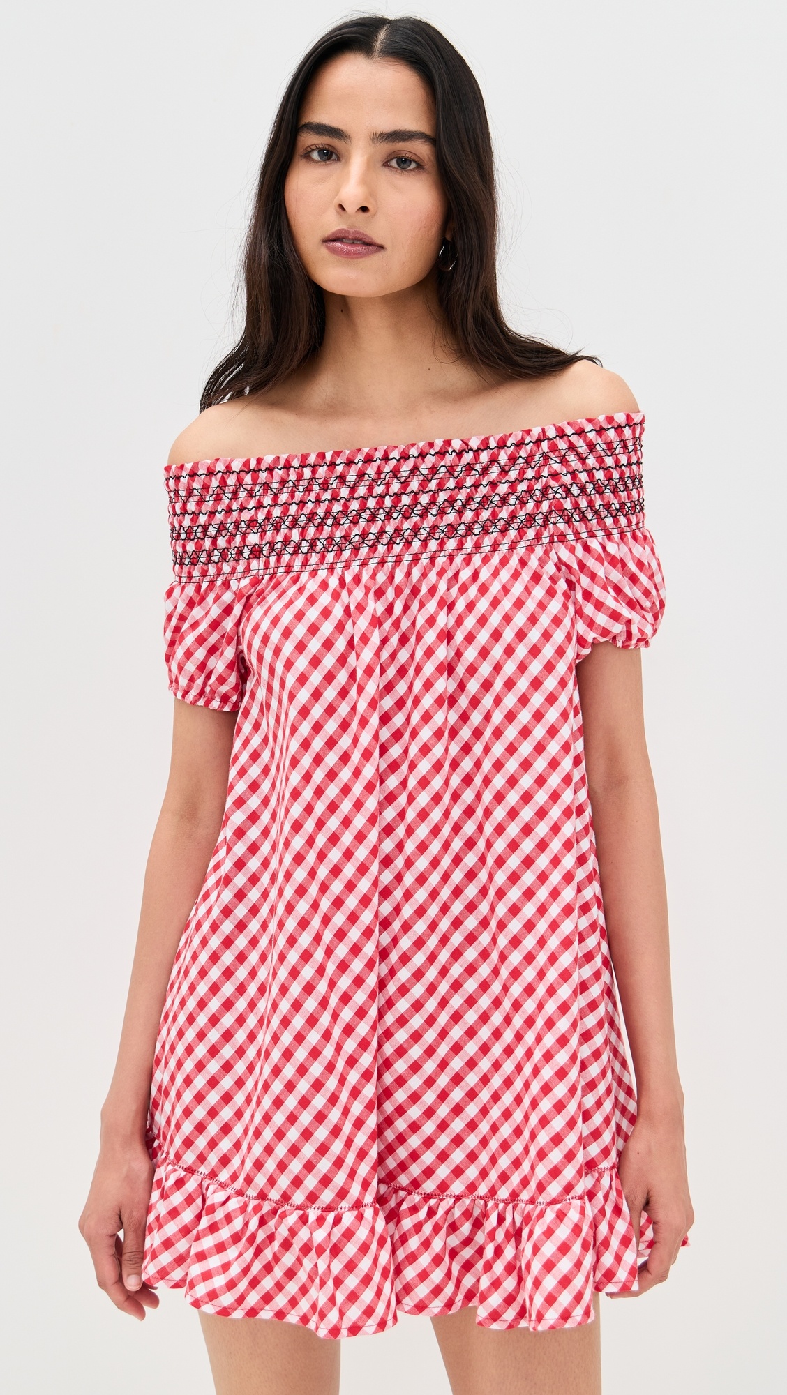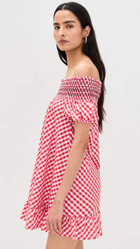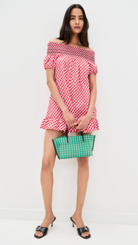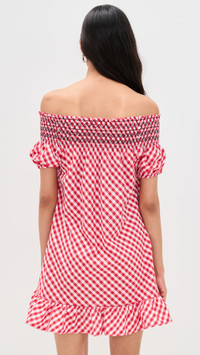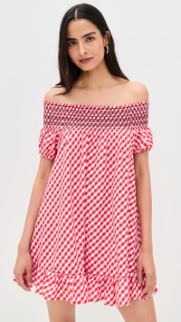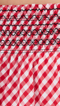 - Fabric: Lightweight, non-stretch weave - Flutter hem and gingham pattern - Smocked elastic at neckline - Mini length - Off-shoulder neckline - Short puff sleeves - Pullover design, no closure - Shell: 100% cotton - Unlined - Dry clean - Imported, China Style #FBKNI30045