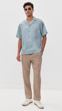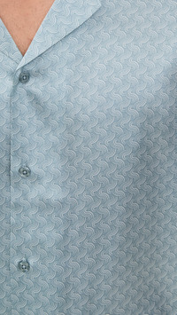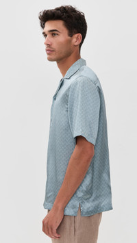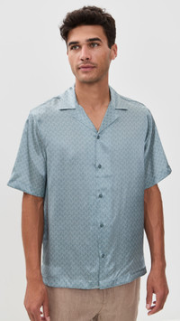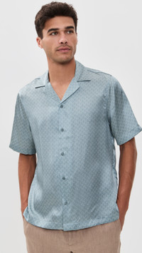 - Fabric: Lightweight, non-stretch satin - Wavy print - Collared neckline - Short sleeves - Button placket - Shell: 100% silk - Hand wash - Made in Portugal Style #FRCOB30115 Size & Fit Model measurements: Size M: Laurence (6'2") usually wears size M Measurements from size M Length: 28.25in / 72cm Sleeve: 19.75in / 50cm Chest: 43.25in / 110cm