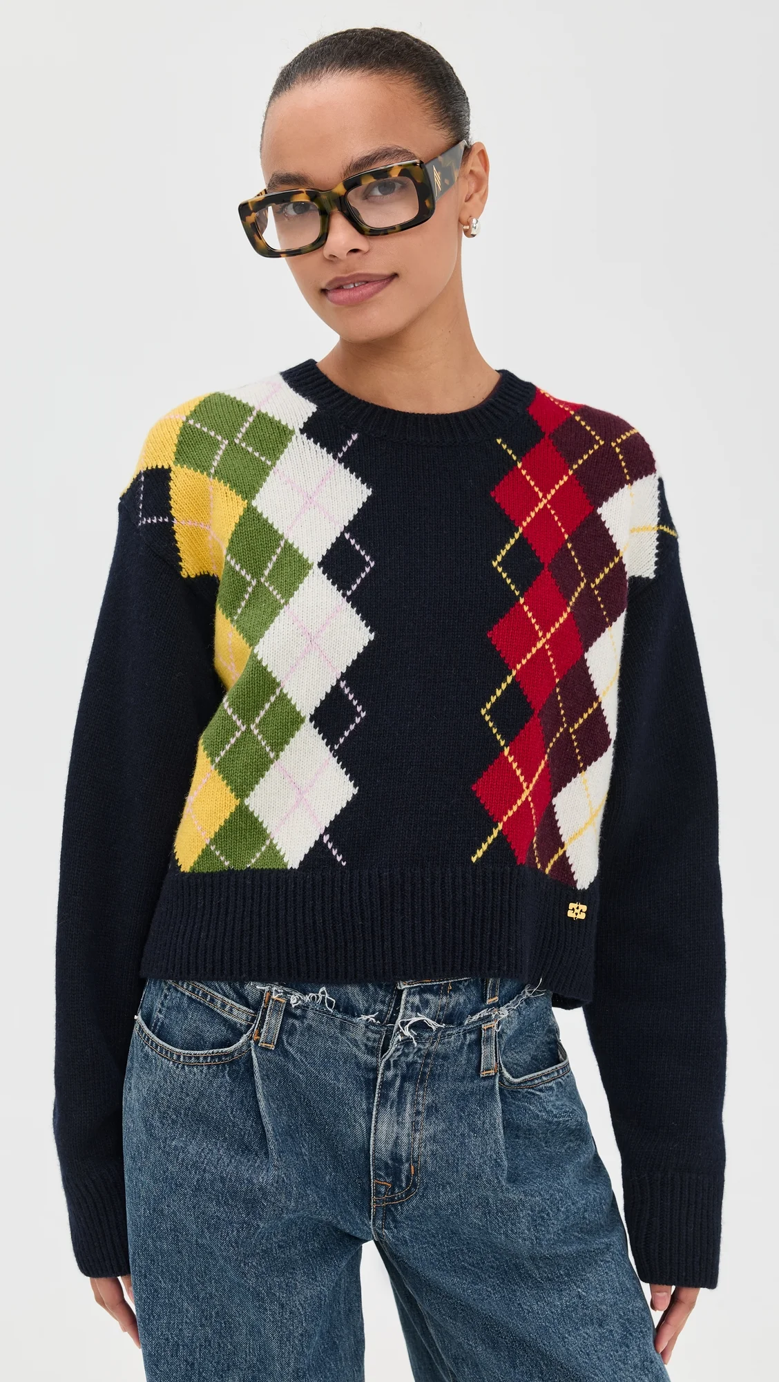 - Fabric: Mid-weight stretch knit - Argyle pattern - Ribbed trim - Crew neck - Long sleeves - Shell: 80% wool/20% polyamide - Unlined - Hand wash or dry clean - Imported, Moldova Style #GANNI32404