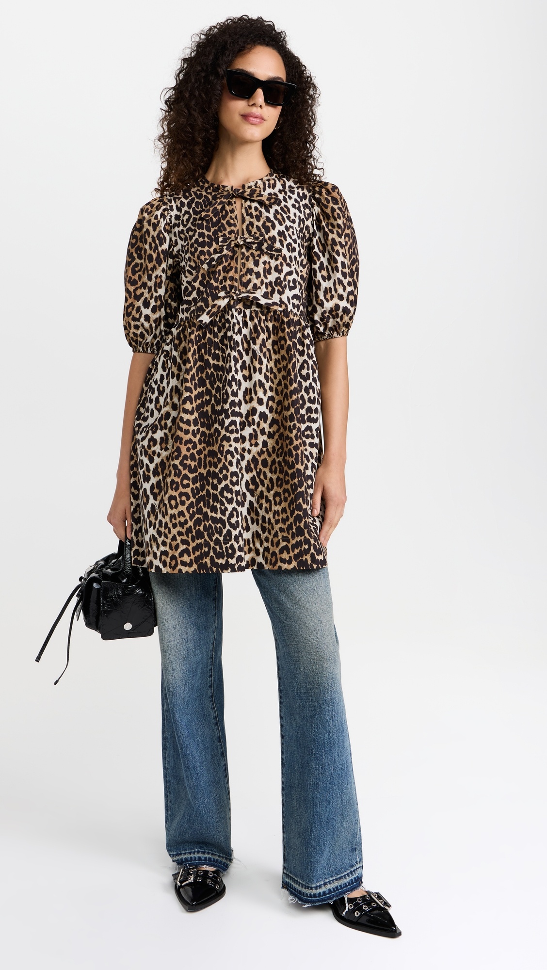 - Fabric: Lightweight, non-stretch poplin - Ties at bust - Leopard print - Mini length - Crew neck - Pullover design, no closure - Shell: 100% cotton - Unlined - Wash cold - Imported, India - Elbow-length puff sleeves with elastic cuffs Style #GANNI32180 Size & Fit An alternative bra works best with the tie placket. Cotton poplin fabric has a smooth, lightweight feel and offers no stretch. Shopbop’s expert stylist says: Runs large; designed with a loose silhouette. For a slimmer fit, size down Customers say: Runs large Model measurements: Size 32: Mily (5'11") usually wears size 32-34 Measurements from size 32 Length: 34.75in / 88.0cm, from shoulder