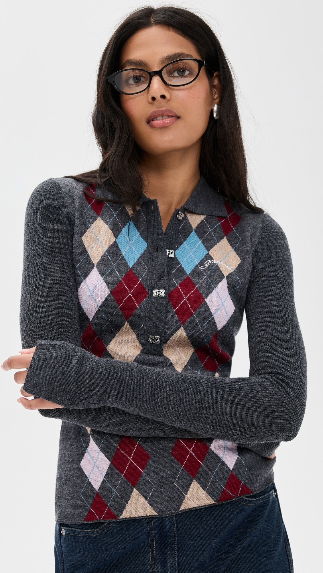 - Fabric: Lightweight stretch knit - Silver-tone logo buttons - Argyle pattern - Embroidered logo lettering at front - Polo neckline - Long sleeves - Partial button placket - Shell: 100% wool - Hand wash - Imported, China Style #GANNI32322 Size & Fit Model measurements: Size S: Samruddhi (5'8") usually wears size XS-S Measurements from size S Length: 22in / 56.0cm, from shoulder
