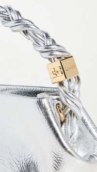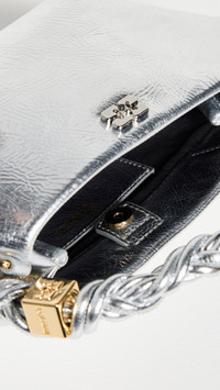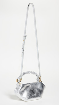 - Cowhide - Crinkled metallic finish - Braided top handle - Logo emblem at side - Magnetic snap - Card slot at interior - Optional, adjustable strap - Textile lining - Weight: 12oz / 0.34kg - Imported, China Style #GANNI32057 Size & Fit Height: 4.75in / 12cm Length: 9.5in / 24cm Depth: 1.5in / 4cm Strap drop: 19.75in / 50cm Handle drop: 2.75in / 7cm