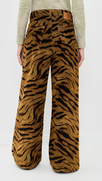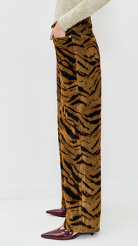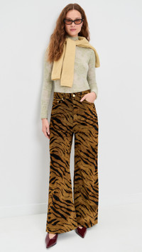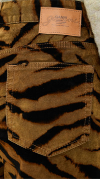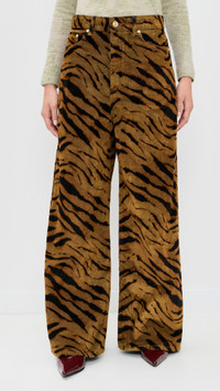 - Fabric: Mid-weight, non-stretch velveteen - Tiger pattern - Logo patch at back - Button closure and zip fly - 5-pocket styling - Shell: 61% cotton/20% viscose/19% polyester - Wash cold - Imported, Tunisia Style #GANNI32333 Size & Fit Model measurements: Size 25: Maia (5'10") usually wears size 25 Measurements from size 26 Rise: 13.75in / 35cm Inseam: 30.25in / 77cm Leg opening: 25.25in / 64cm