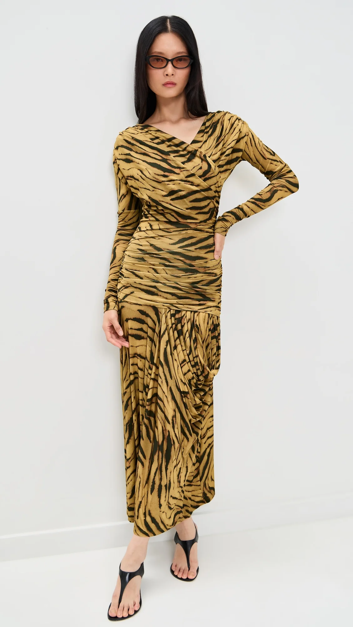 - Fabric: Mid-weight, super-stretch slinky jersey - Draped bodice - Tiger stripe pattern - Maxi length - Surplice neckline - Long sleeves - Pullover design, no closure - Shell: 95% polyester/5% spandex - Lined - Wash cold - Imported, Turkey Style #GANNI32342