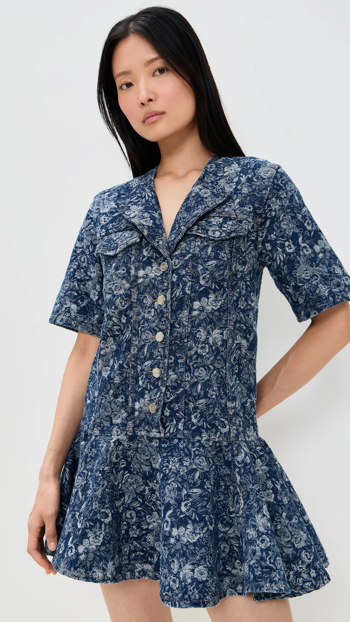 - Fabric: Mid-weight, low-stretch denim - Floral brocade pattern - Ruffled hem - Mini length - Collared neck - Short sleeves - Button placket - Flap breast pockets - Shell: 100% cotton - Wash cold - Imported, Tunisia Style #GANNI32324