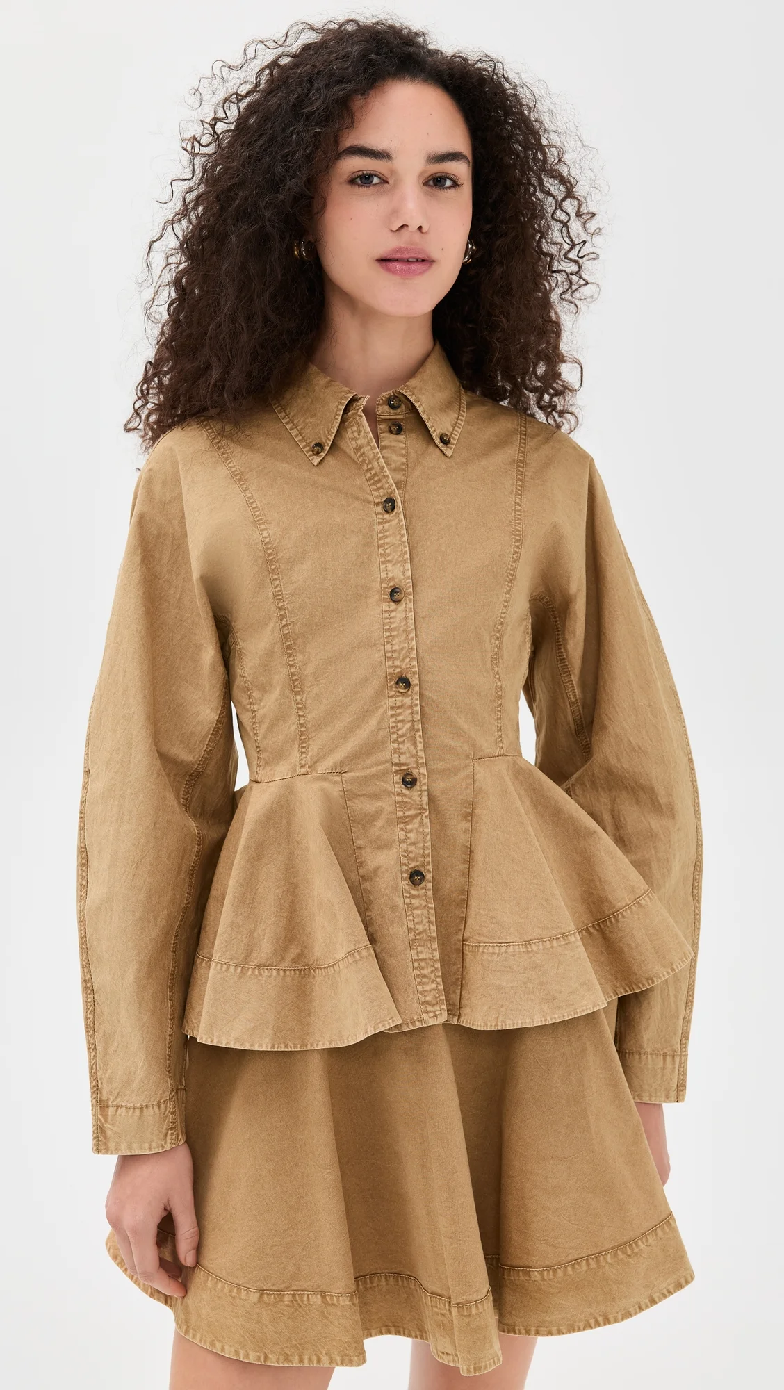- Fabric: Lightweight stretch weave - Peplum hem - Collared neck - Long sleeves - Button placket - Shell: 97% cotton/3% elastane - Wash cold - Imported, India Style #GANNI32321
