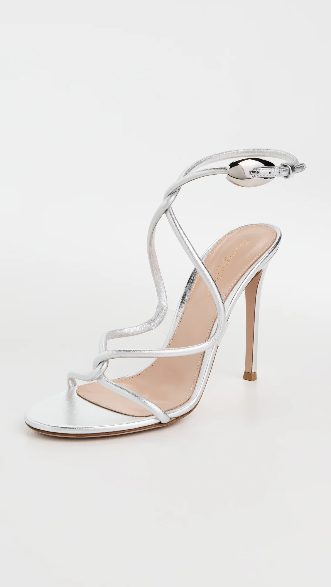 - Upper: Leather - Silver-tone buckle and finish - Twisted strap design - Lightly cushioned footbed - Lining: Leather - Stiletto heel - Buckle ankle strap - Open toe - Leather sole with rubber heel cap - Made in Italy - This item cannot be gift-boxed Style #GIANR30067