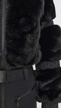 - Fabric: Heavyweight technical weave with stretch - Faux fur bodice and trim - Zip cuffs with interior snow catchers - Optional logo elastic belt with buckle closure - Mock neck - Long sleeves - Zip at front - Zip exterior and interior pockets - Shell: 74% polyamide/26% elastane - Trim: 100% polyester - Lined - Lining: 100% polyester - Wash cold - Imported, China Style #GBERG30118 Size & Fit Model measurements: Size 32: Mily (5'11") usually wears size 32 Measurements from size 32 Inseam: 30in / 76cm Leg opening: 18in / 46cm