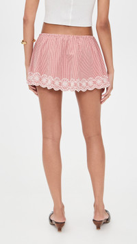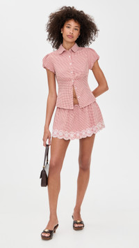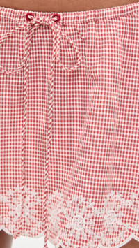 - Fabric: Lightweight, non-stretch gingham weave - Check pattern - Scalloped daisy lace hem - Covered elastic waist with drawstring - Shell: 65% polyester/35% cotton - Unlined - Hand wash - Imported, China Style #DGUIZ30061 Size & Fit Customers say: Runs large; please size down. Model measurements: Size XS: Drew (5'8") usually wears size XS-S Measurements from size XS Length: 11.5in / 29.0cm