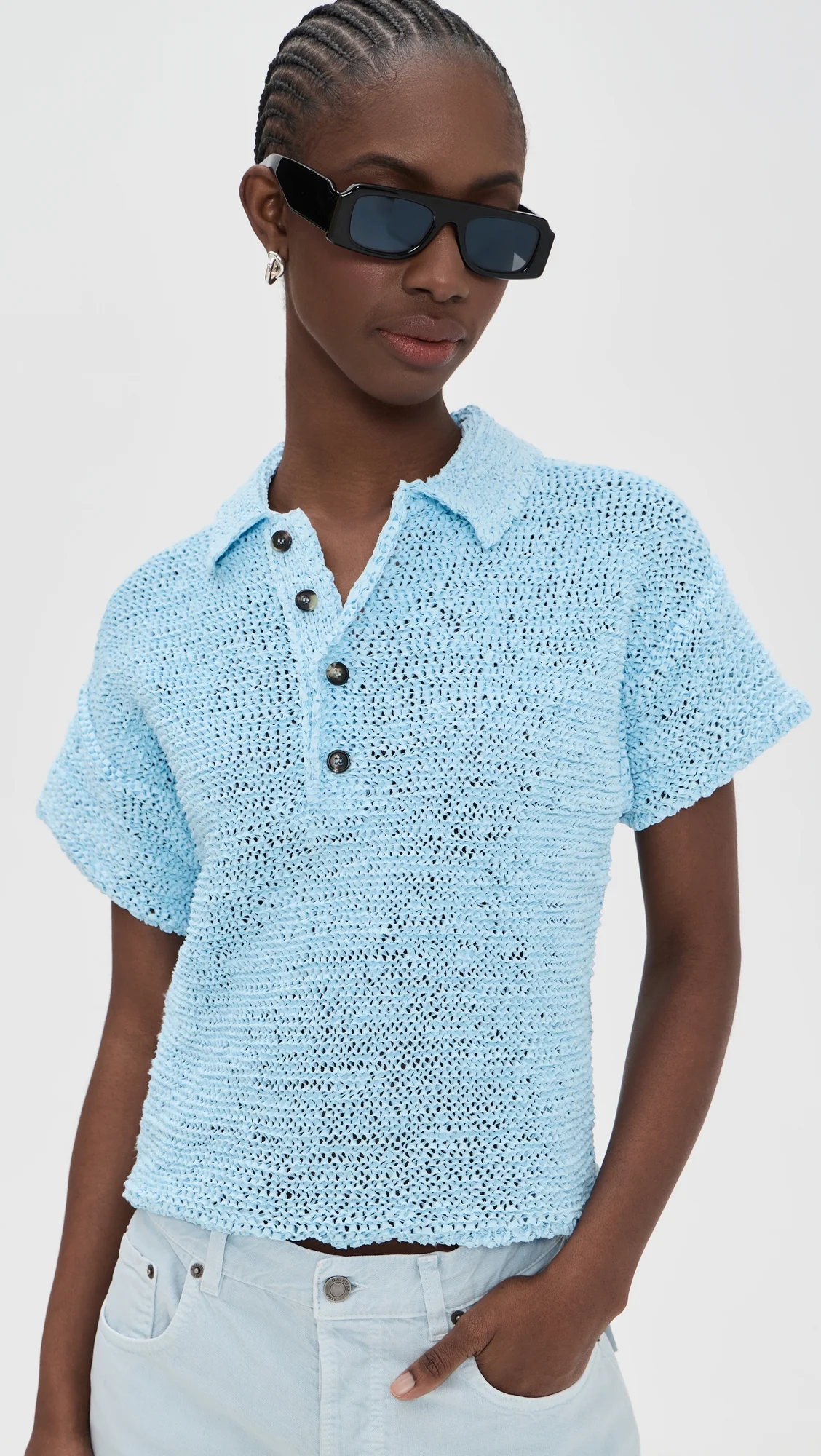 - Fabric: Mid-weight loose knit with stretch - Drop shoulders - Collared neck - Short sleeves - Partial button placket - Semi-sheer - Shell: 70% polyester/30% polyamide - Wash cold - Made in Italy Style #HAIKU30075 Size & Fit Model measurements: Size S: Cher (5'11") usually wears size XS Measurements from size S Length: 20in / 51.0cm, from shoulder