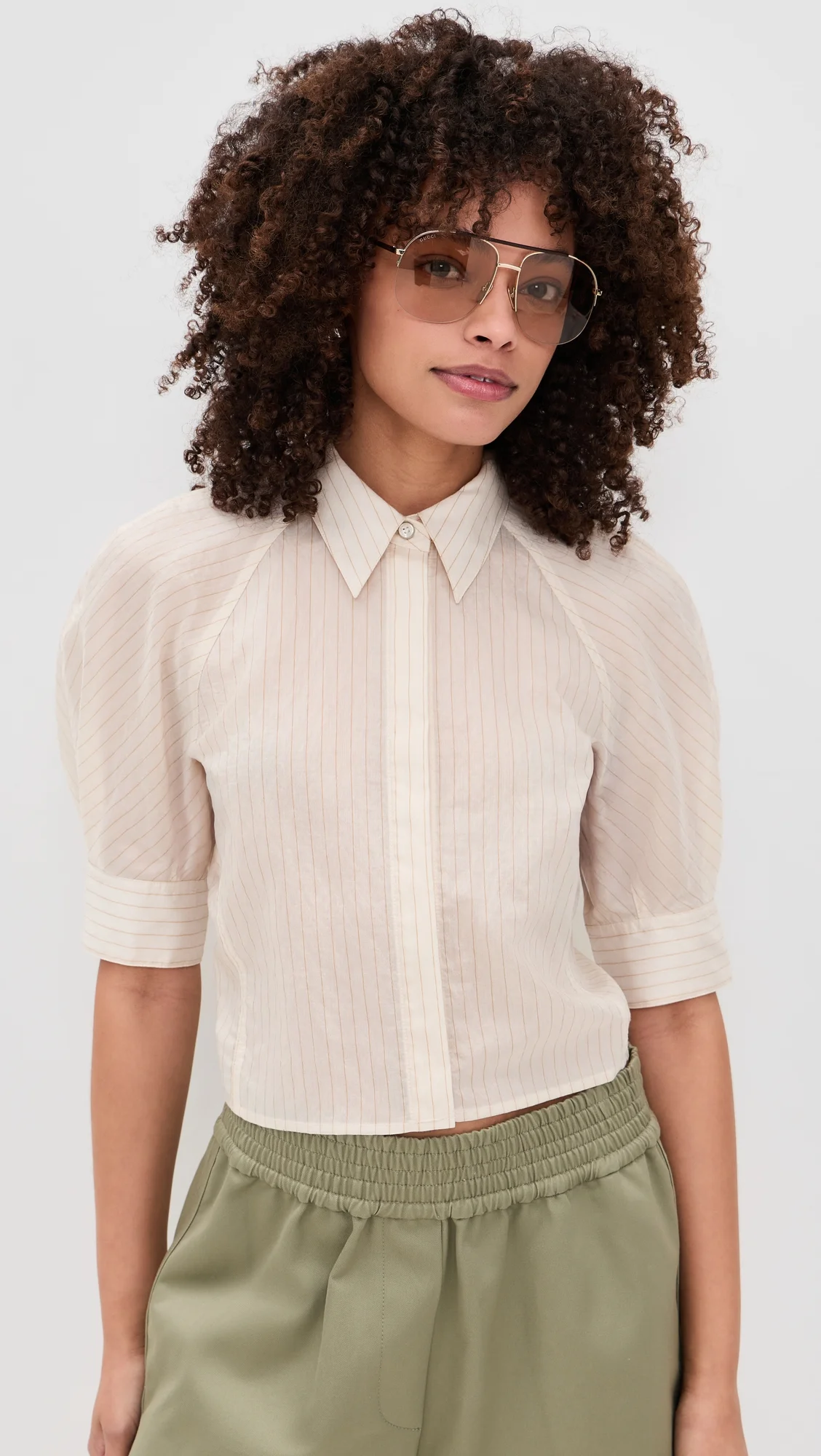 - Fabric: Lightweight, non-stretch weave - Collared neck - Short sleeves - Covered button placket - Semi-sheer - Shell: 61% cupro/27% polyamide/8% silk/4% polyester - Dry clean - Imported, Vietnam Style #HLANG42330 Size & Fit Model measurements: Size S: Alexis (5'8") usually wears size XS-S Measurements from size S Length: 18.5in / 47.0cm, from shoulder