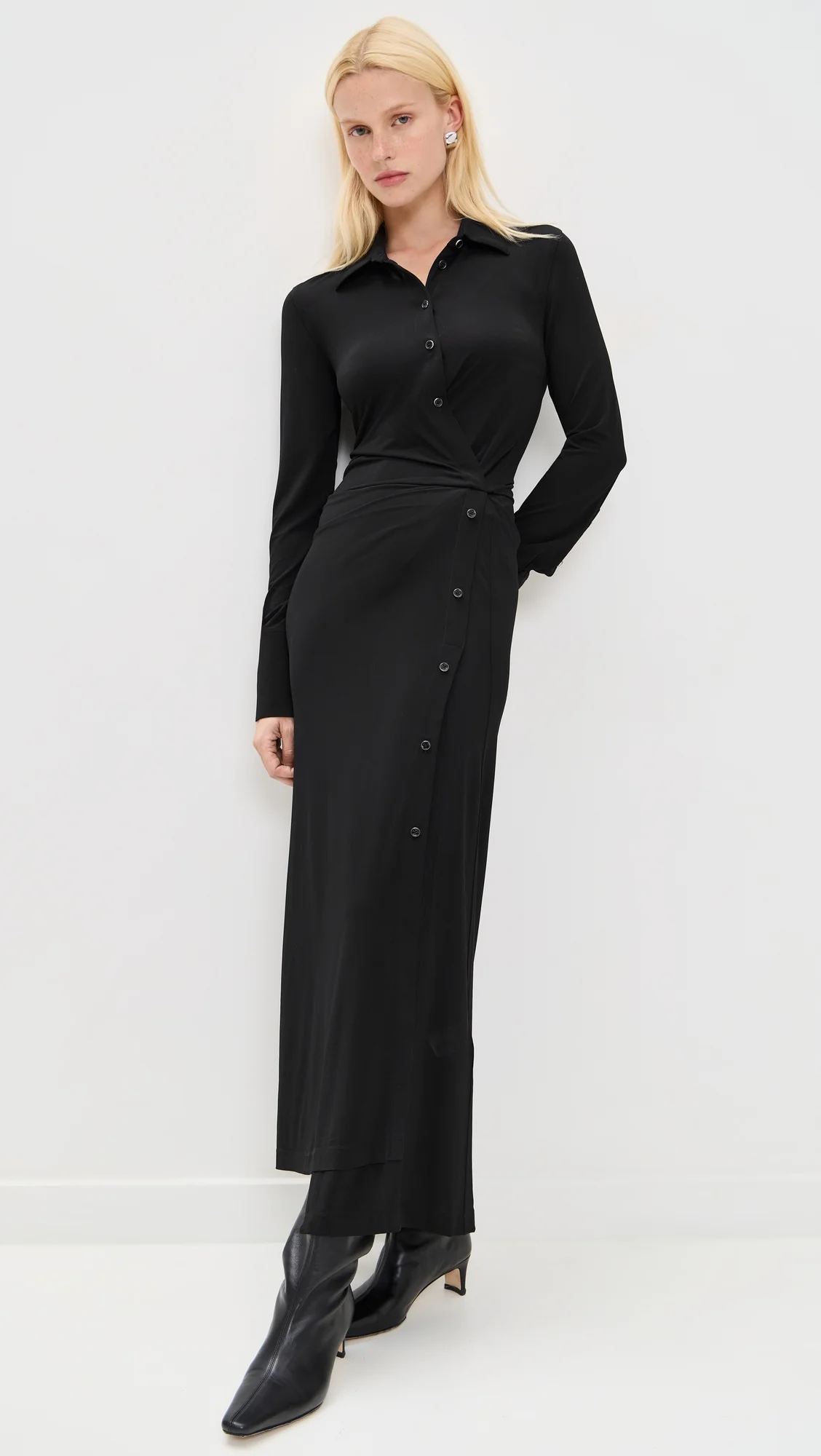 - Fabric: Lightweight, super-stretch slinky jersey - Twisted design - Maxi length - Collared neck - Long sleeves with button cuffs - Partial button placket - Shell: 95% viscose/5% elastane - Dry clean - Imported, China Style #HLANG42322