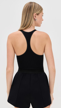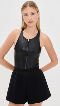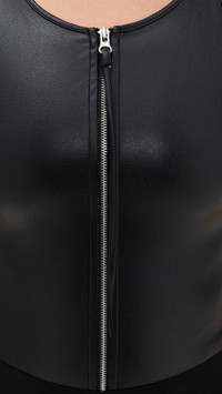 - Fabric: Lightweight faux leather with stretch - Jersey back panel - Scoop neck - Sleeveless - Thong back and snap gusset - Zip at front - Shell: 100% polyurethane - Trim: 100% polyester - Unlined - Dry clean - Imported, China Style #HLANG42291