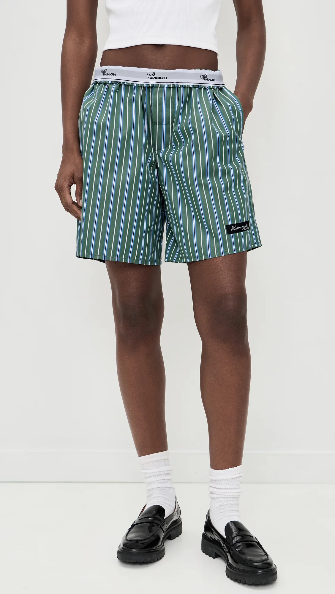 - Fabric: Lightweight, non-stretch shirting - Logo elastic waistband - Stripe print - Shell: 100% cotton - Wash warm - Made in Italy Style #HOMME30081 Size & Fit Model measurements: Size S: Cher (5'11") usually wears size XS Measurements from size S Rise: 11.75in / 30cm Inseam: 7.75in / 20cm