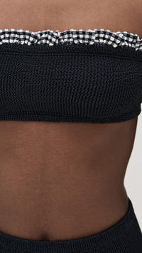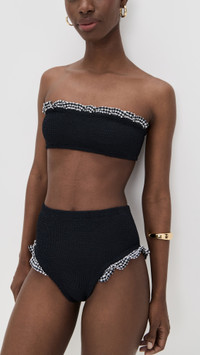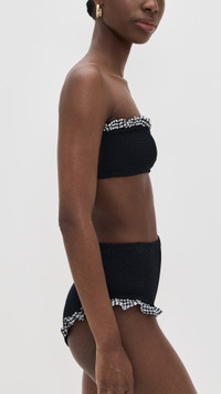 - Produced via carbon-neutral manufacturing - Allover smocking - Check print and ruffled edges - Moderate coverage - High waisted - Shell: 97% polyamide/3% elastane - Unlined - Hand wash - Imported, Morocco Style #HUNZA30346 Size & Fit Model measurements: Size One Size: Cher (5'11")