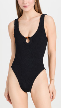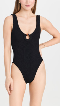 - Crinkle fabric - Acrylic ring at front - Produced via carbon-neutral manufacturing - Cheeky coverage - Shell: 97% polyamide/3% elastane - Wash cold - Imported, Morocco Style #HUNZA30219 Size & Fit Fits US sizes 2-12. Model measurements: Size One Size: Gabriela (5'9")