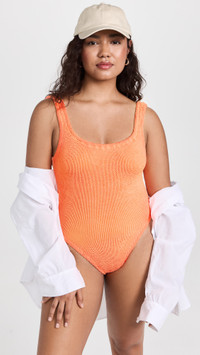 - Crinkle fabric - Produced via carbon-neutral manufacturing - Square neck and scoop back - Cheeky coverage - Shell: 88% nylon/12% lycra spandex - Hand wash - Made in United Kingdom Style #HUNZA30113 Size & Fit Fits US sizes 2-12. Model measurements: - Size One Size: Natasha (5'9") - Size One Size: Berry (6'0")