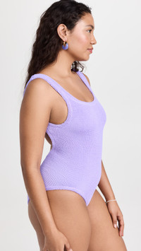 - Produced via carbon-neutral manufacturing - Crinkle fabric - Square neck and scoop back - Cheeky coverage - Shell: 88% nylon/12% lycra spandex - Hand wash - Made in United Kingdom Style #HUNZA30101 Size & Fit Fits US sizes 2-12. Customers say: Runs small; please size up. Model measurements: - Size One Size: Natasha (5'9") - Size One Size: Nikayla (5'9.5")