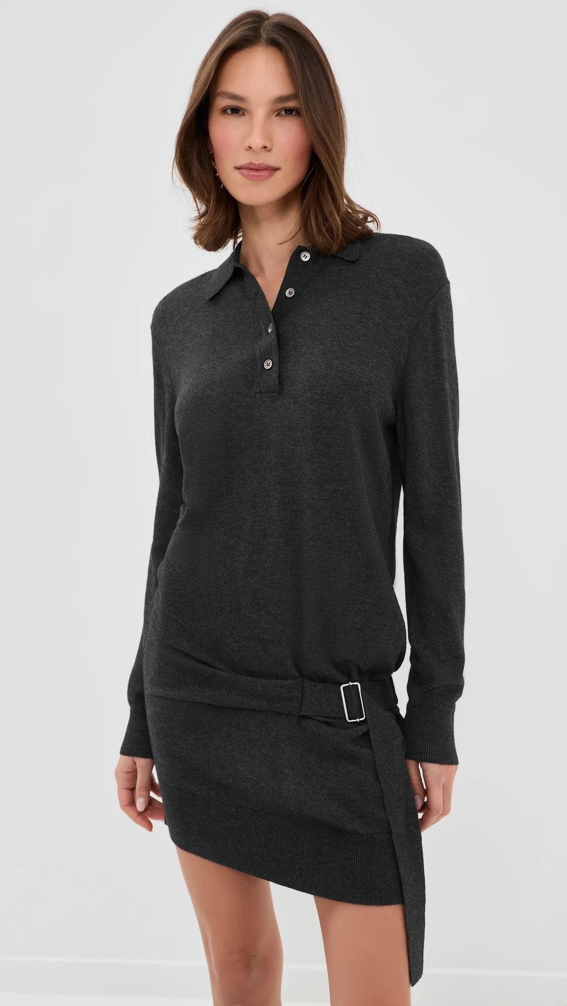 - Fabric: Lightweight, super-stretch knit - Ribbed trim - Mini length - Polo neckline - Long sleeves - Partial button placket - Self-belt at waist - Shell: 70% viscose/30% wool - Unlined - Dry clean - Imported, China Style #ISMDB32420 Size & Fit Model measurements: Size 34: Anna (6'0") usually wears size 32-34 Measurements from size 34 Length: 32.75in / 83.0cm, from shoulder