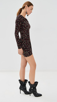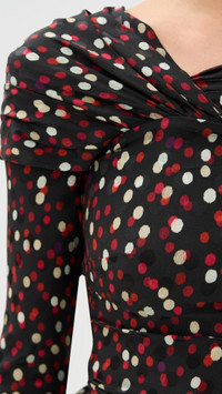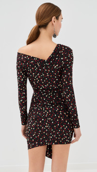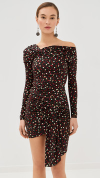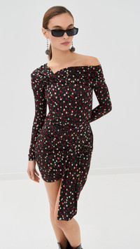 - Fabric: Lightweight stretch satin - Asymmetrical neckline - Gathered detailing and draped skirt - Polka-dot print - Mini length - Off-shoulder neckline - Long sleeves - Shell: 90% silk/10% elastane - Unlined - Dry clean - Imported, India Style #ISMDB32307 Size & Fit Model measurements: Size 34: Mia (5'9.5") usually wears size 32 Measurements from size 6 Length: 35.5in / 90.0cm, from shoulder