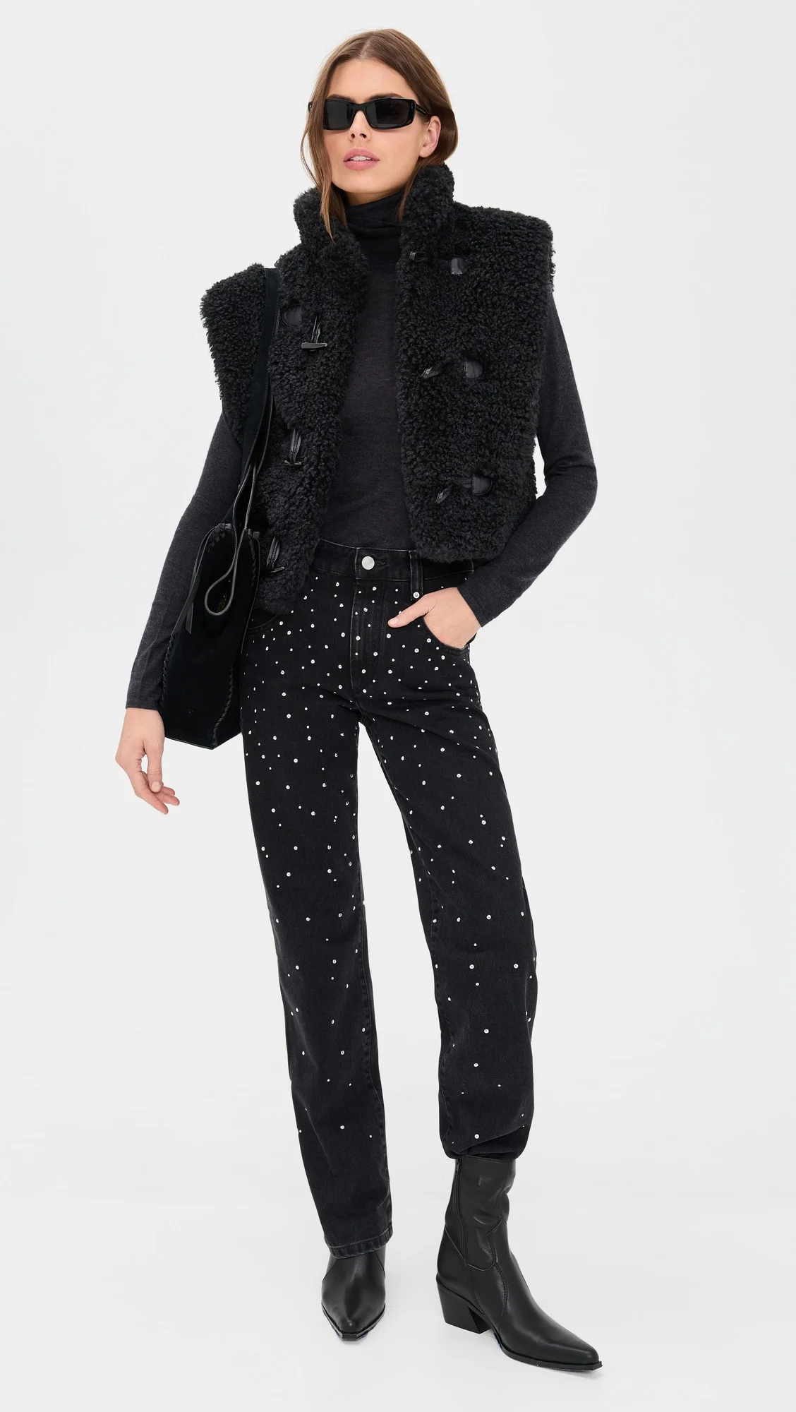 - Fabric: Heavyweight non stretch faux shearling - Faux leather toggle closures - Collared neck - Short cap sleeves - Shell: 100% polyester - Lined - Dry clean - Imported, India Style #IMARA31034