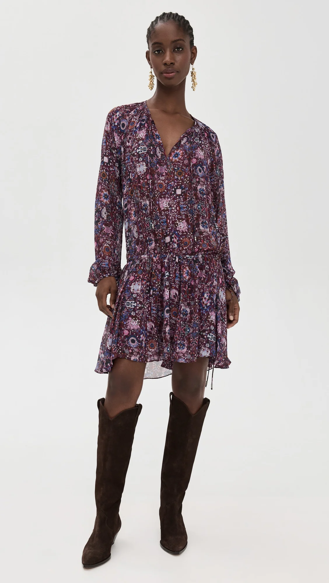 - Fabric: Lightweight, non-stretch georgette - Drawstring at drop waist - Floral print - Mini length - Split neckline - Long sleeves with button cuffs - Tie keyhole at neckline - Shell: 100% viscose - Unlined bodice, lined skirt - Lining: 100% viscose - Dry clean - Imported, India Style #IMARA30978 Size & Fit The drawstring can be used to cinch the waist. Viscose fabric has an airy feel and offers minimal stretch. Shopbop’s expert stylist says: Runs large; designed with a relaxed silhouette. For a slimmer fit, size down Customers say: Runs large; please size down. Model measurements: Size 34: Cher (5'11") usually wears size 32 Measurements from size 34 Length: 37in / 94.0cm, from shoulder