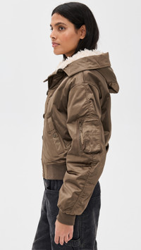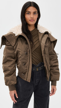 - Fabric: Heavyweight, non-stretch technical weave - Button flap and hidden zip placket - Ribbed knit edges - Faux shearling trim - Convertible hood with zip - Hooded neckline - Long sleeves with dropped shoulders - Slant hip pockets - Shell: 100% polyester - Lined - Lining: 100% polyamide - Fill: 100% polyester - Dry clean - Imported, China Style #IMARA30984 Size & Fit Model measurements: Size 34: Samruddhi (5'8") usually wears size 32-34 Measurements from size 34 Length: 20.5in / 52.0cm, from shoulder