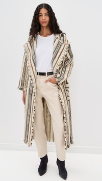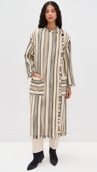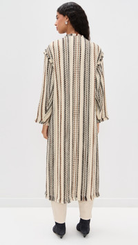 - Fabric: Mid-weight, non-stretch weave - Button closure - Fringe trim and stripe pattern - Shawl collar - Long sleeves - Patch front pockets - Shell: 39% cotton/36% acrylic/22% wool/3% other fibers - Unlined - Dry clean - Imported, Bulgaria Style #IMARA31001 Size & Fit Model measurements: Size 34: Rocio (5'11") usually wears size 32 Measurements from size 34 Length: 47.25in / 120.0cm, from shoulder