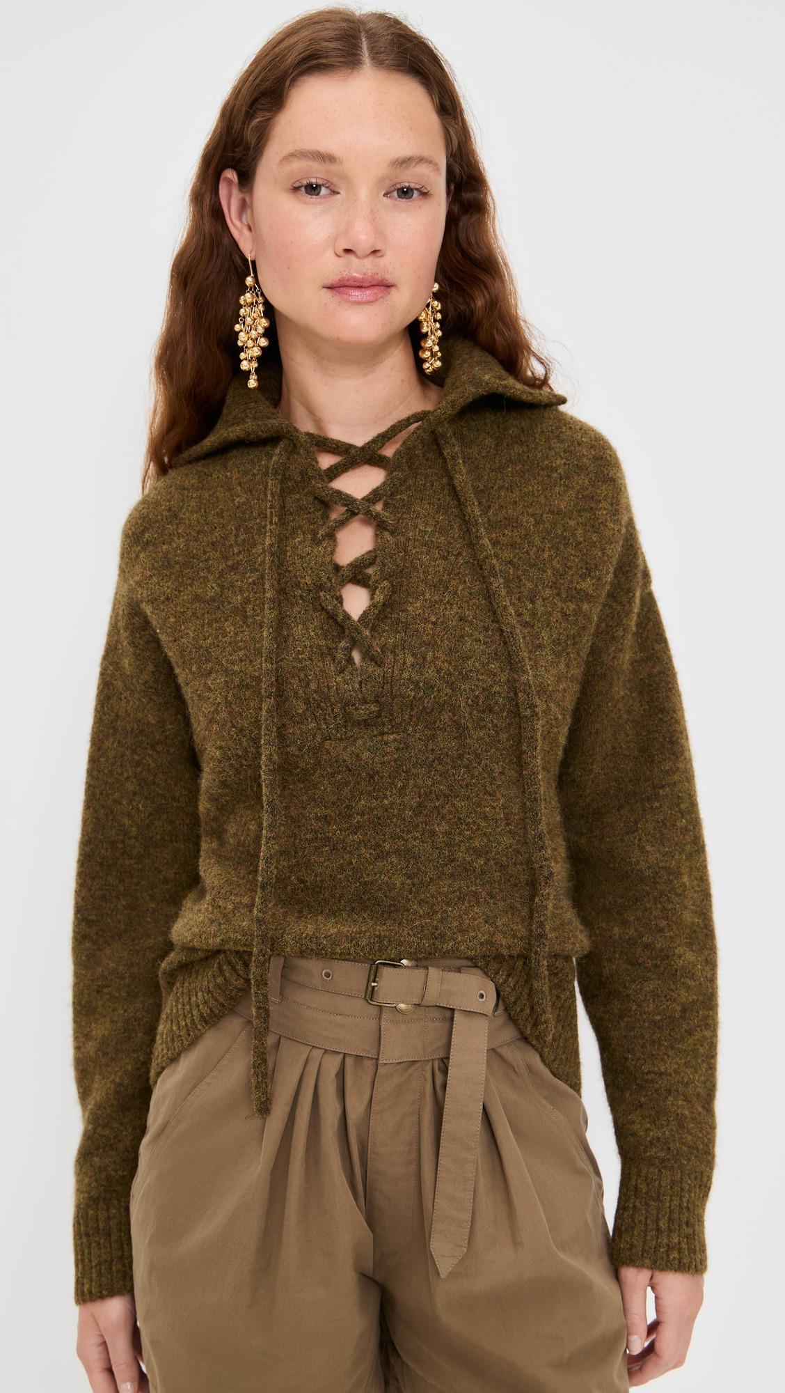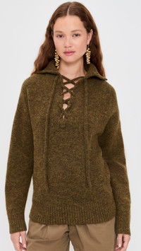 - Fabric: Mid-weight stretch knit - Ribbed edges - Collared neck - Long sleeves with dropped shoulders - Lace-up at front - Shell: 62% baby alpaca/33% polyamide/5% elastane - Dry clean - Imported, China Style #IMARA31009 Size & Fit Model measurements: Size 34: Maia (5'10") usually wears size 32 Measurements from size 34 Length: 24.5in / 62.0cm, from shoulder