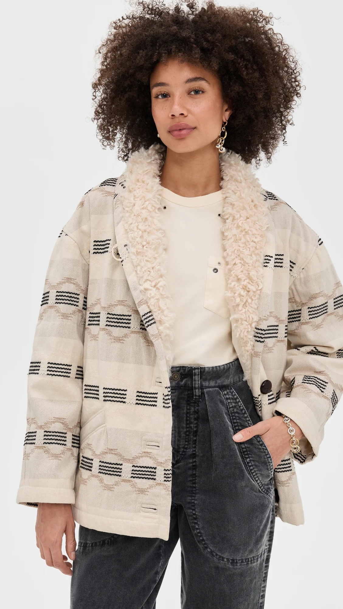 - Fabric: Heavyweight, non-stretch jacquard - Faux shearling collar - Shawl collar - Long sleeves with dropped shoulders - Button placket - Slant hip pockets - Shell: 48% cotton/38% polyester/14% viscose - Lined - Lining: 100% cotton - Dry clean - Imported, India Style #IMARA31095 Size & Fit Model measurements: Size 34: Drew (5'8") usually wears size 32-34 Measurements from size 34 Length: 28in / 71.0cm, from shoulder