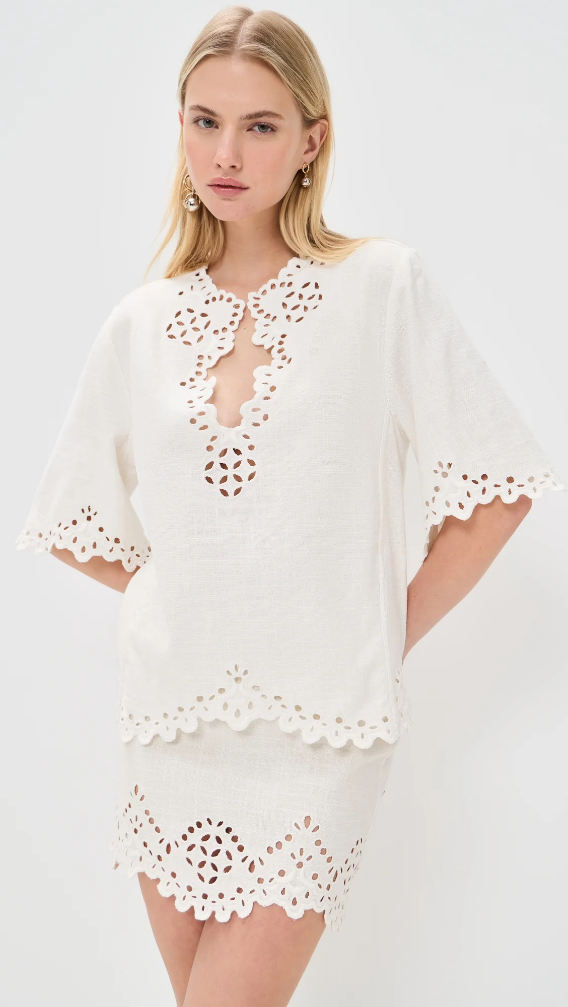 - Fabric: Mid-weight, non-stretch slubbed weave - Eyelet embroidery - V neck - Short sleeves - Pullover design, no closure - Shell: 100% cotton - Wash cold - Imported, India Style #IMARA31083 Size & Fit Model measurements: Size 34: Kayla (5'7.5") usually wears size 32-34 Measurements from size 34 Length: 22.75in / 58.0cm, from shoulder