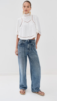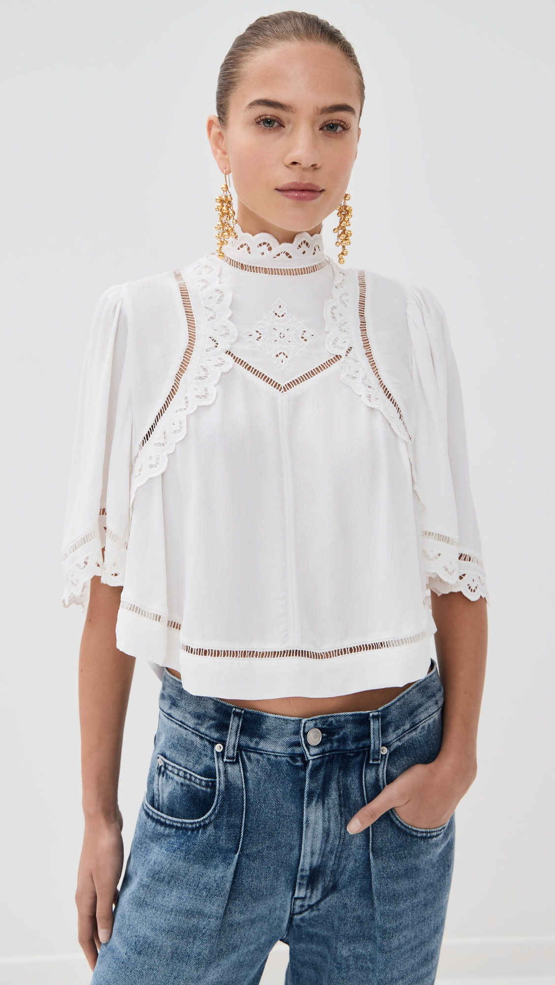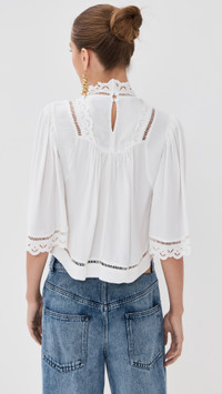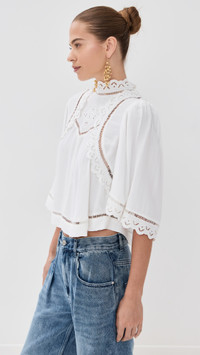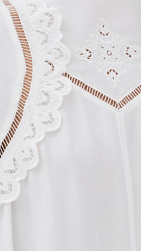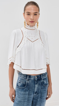 - Fabric: Lightweight, non-stretch crepe weave - Embroidered and lace details - Pleated and V-shaped yoke - Mock neck - Short flutter sleeves - Button keyhole at back - Shell: 100% viscose - Dry clean - Imported, India Style #ISMDB32194