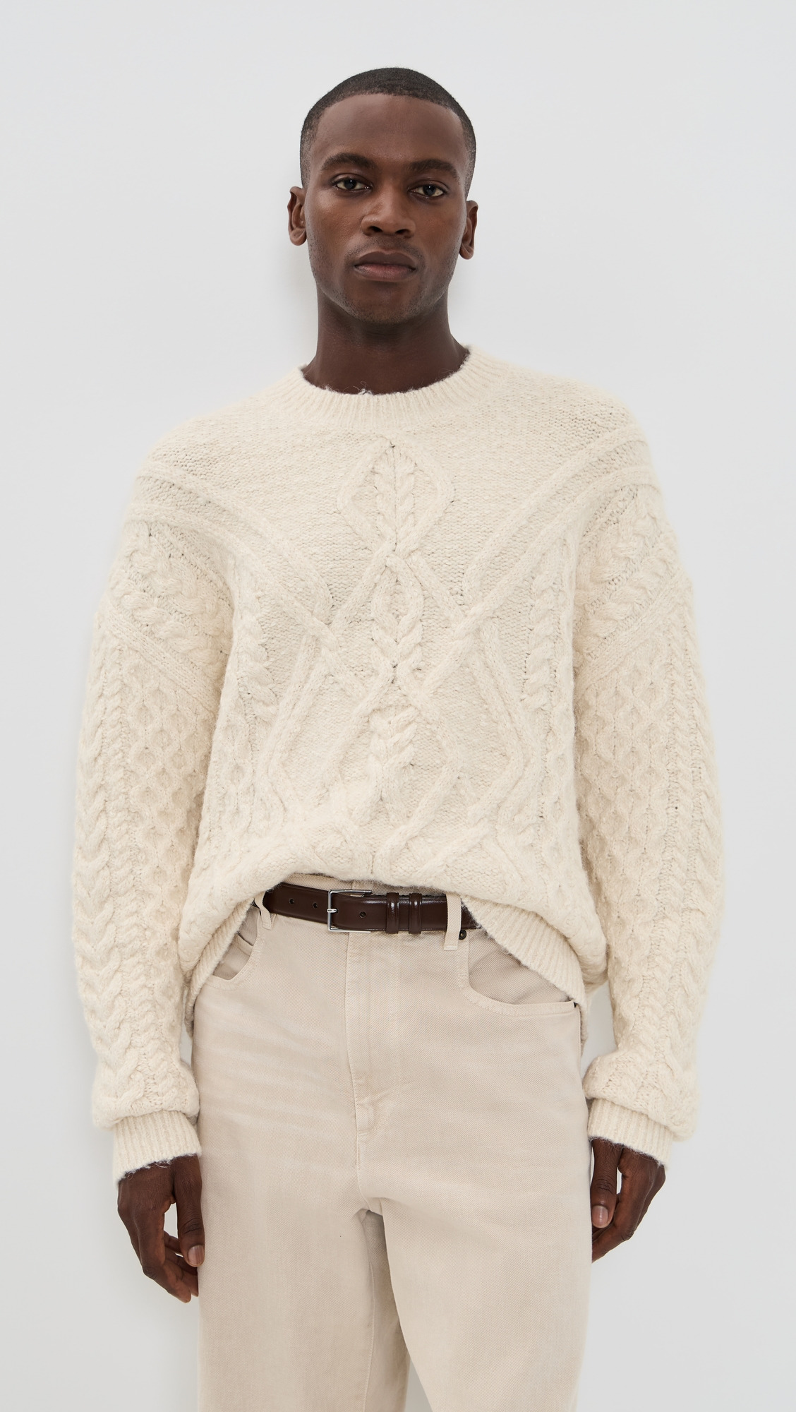 - Fabric: Heavyweight chunky cable knit with stretch - Ribbed trim - Crew neck - Long sleeves with dropped shoulders - Shell: 57% cotton/14% polyamide/13% alpaca/11% acrylic/4% wool/1% elastane - Hand wash - Imported, China Style #ISMAR31195 Size & Fit Model measurements: Size L: Idriss (6'1") usually wears size M-L Measurements from size L Length: 26in / 66cm Sleeve: 33.5in / 85cm Chest: 49.5in / 126cm