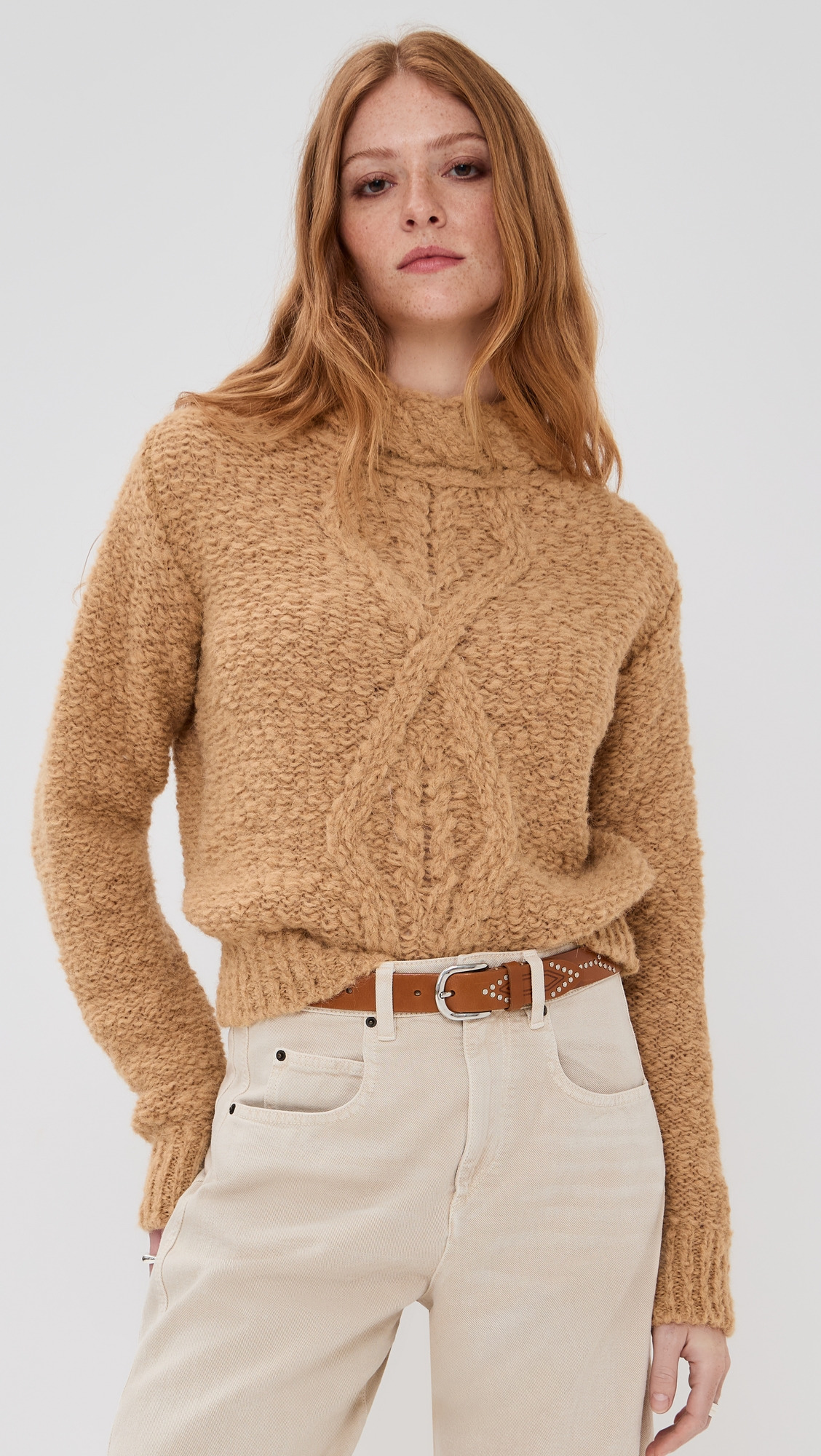 - Fabric: Heavyweight cable knit with stretch - Ribbed trim - Mock neck - Long sleeves - Shell: 87% alpaca/13% polyamide - Hand wash - Made in Italy Style #ISMDB32211 Size & Fit Model measurements: Size 36: Haley (5'9.5") usually wears size 34 Measurements from size 34 Length: 19in / 48.0cm, from shoulder