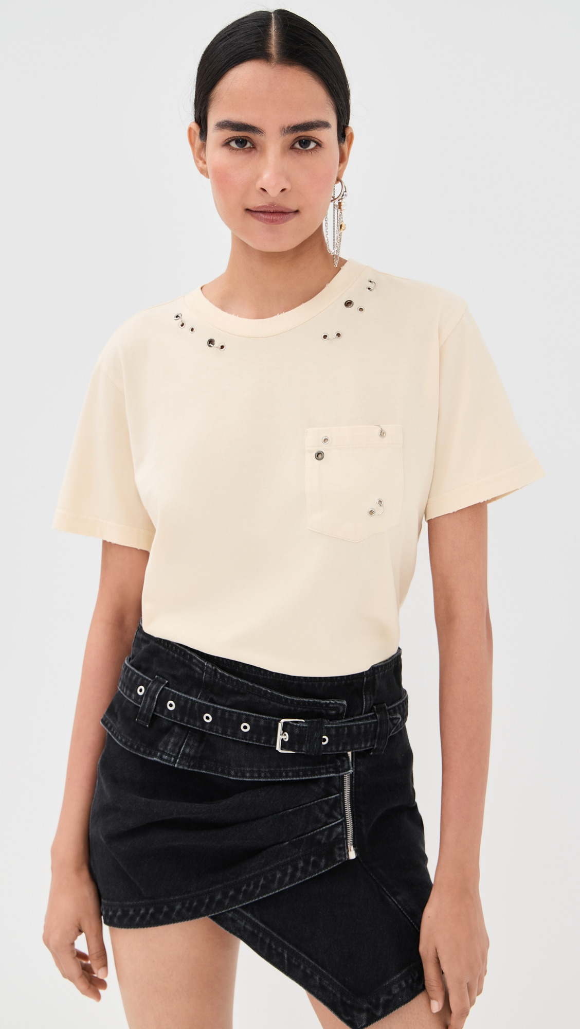 - Fabric: Lightweight stretch jersey - Rivet and hoop details - Distressed trim - Crew neck - Short sleeves - Patch breast pocket - Shell: 100% cotton - Dry clean - Made in Portugal Style #ISMDB32310