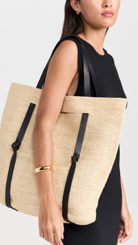 - Woven raffia - Leather trim with knotted detail - Open top - Shoulder straps - Unlined - Weight: 19oz / 0.54kg - Imported, Madagascar Style #JANES30274
