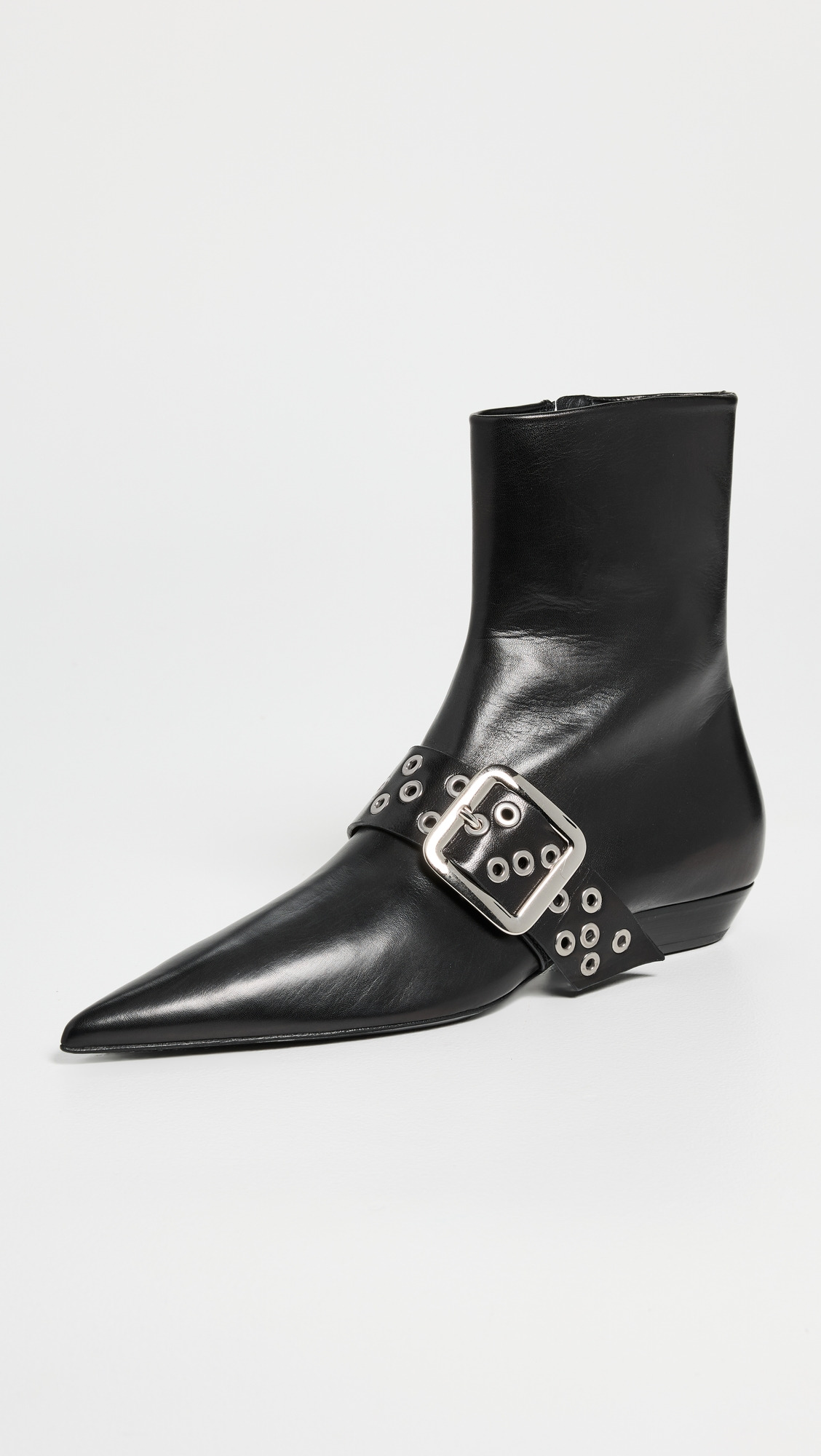- Upper: Goatskin - Cross-over belt with silver-tone hardware - Lining: Leather - Stacked heel - Ankle zip - Pointed toe - Leather sole with rubber heel cap - Made in Italy - This item cannot be gift-boxed Style #JLSAN30222