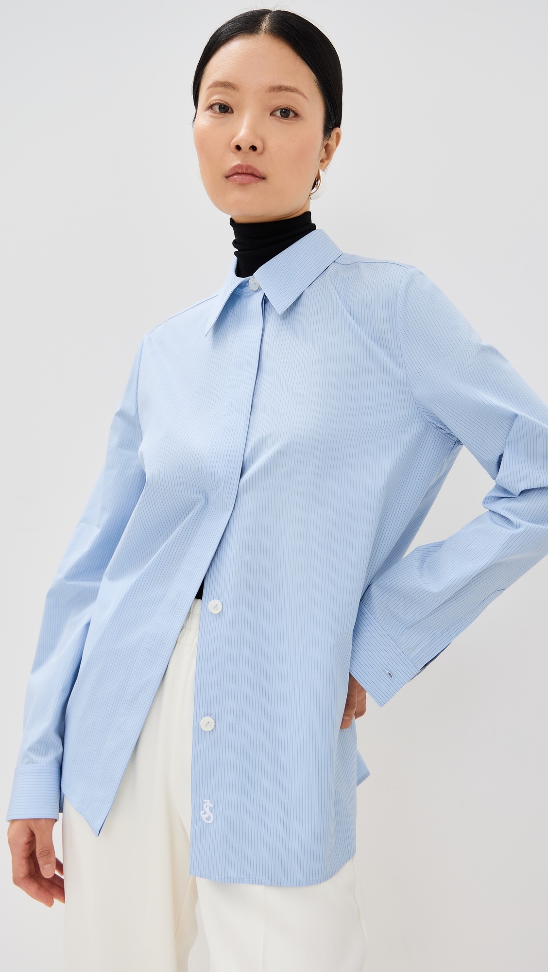 - Fabric: Lightweight, non-stretch shirting - Pinstripe pattern - Collared neck - Long sleeves with button cuffs - Covered elastic waistband - Shell: 100% cotton - Dry clean - Made in Italy Style #JLSAN30180