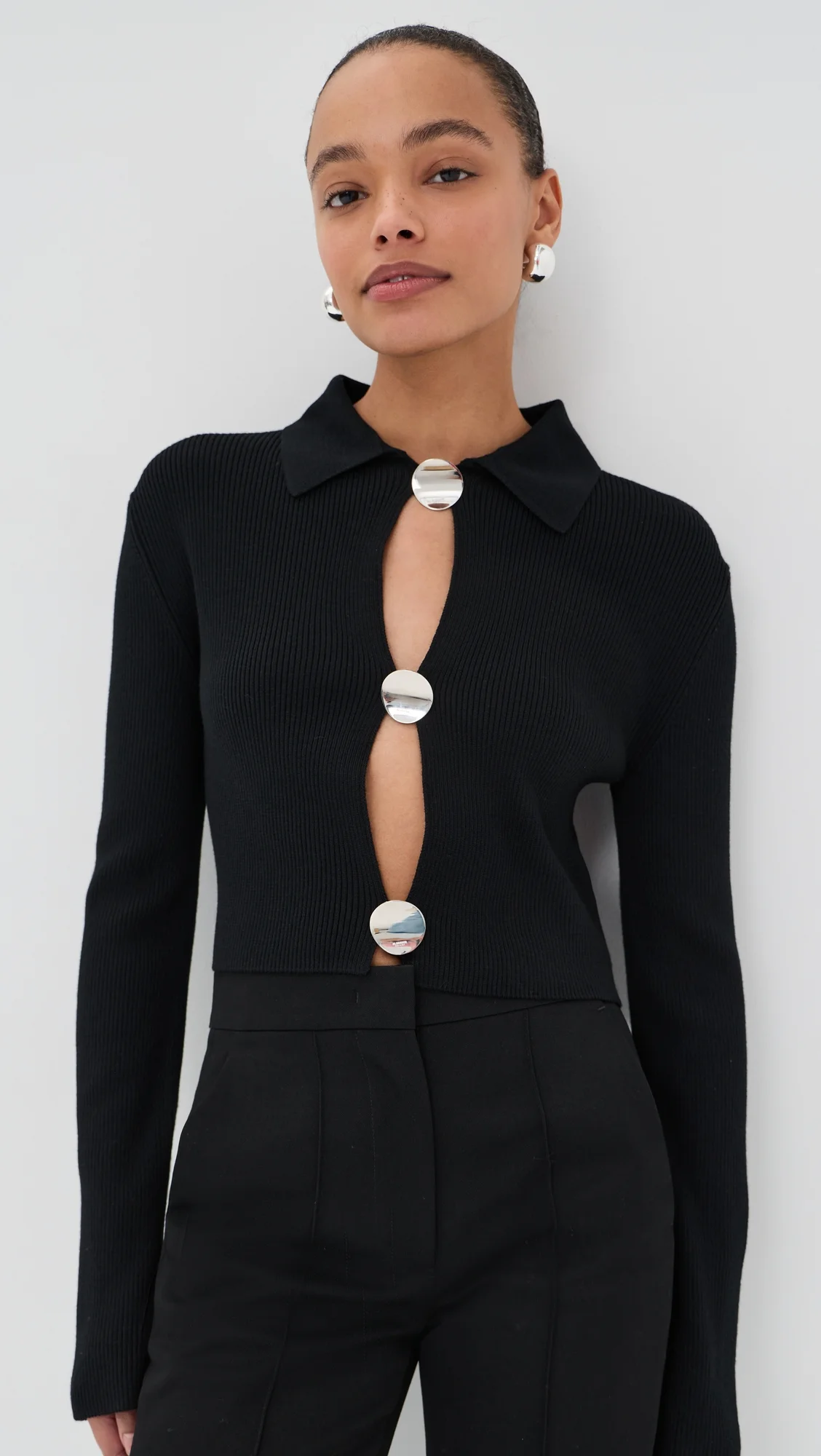 - Fabric: Mid-weight ribbed knit with stretch - Cutouts at placket - Detachable silver-tone button hardware - Collared neck - Long sleeves - Button placket - Shell: 100% wool - Dry clean - Made in Italy Style #JLSAN30290 Size & Fit Model measurements: Size 34: Alexis (5'8") usually wears size 32 Measurements from size 36 Length: 17.25in / 44.0cm, from shoulder
