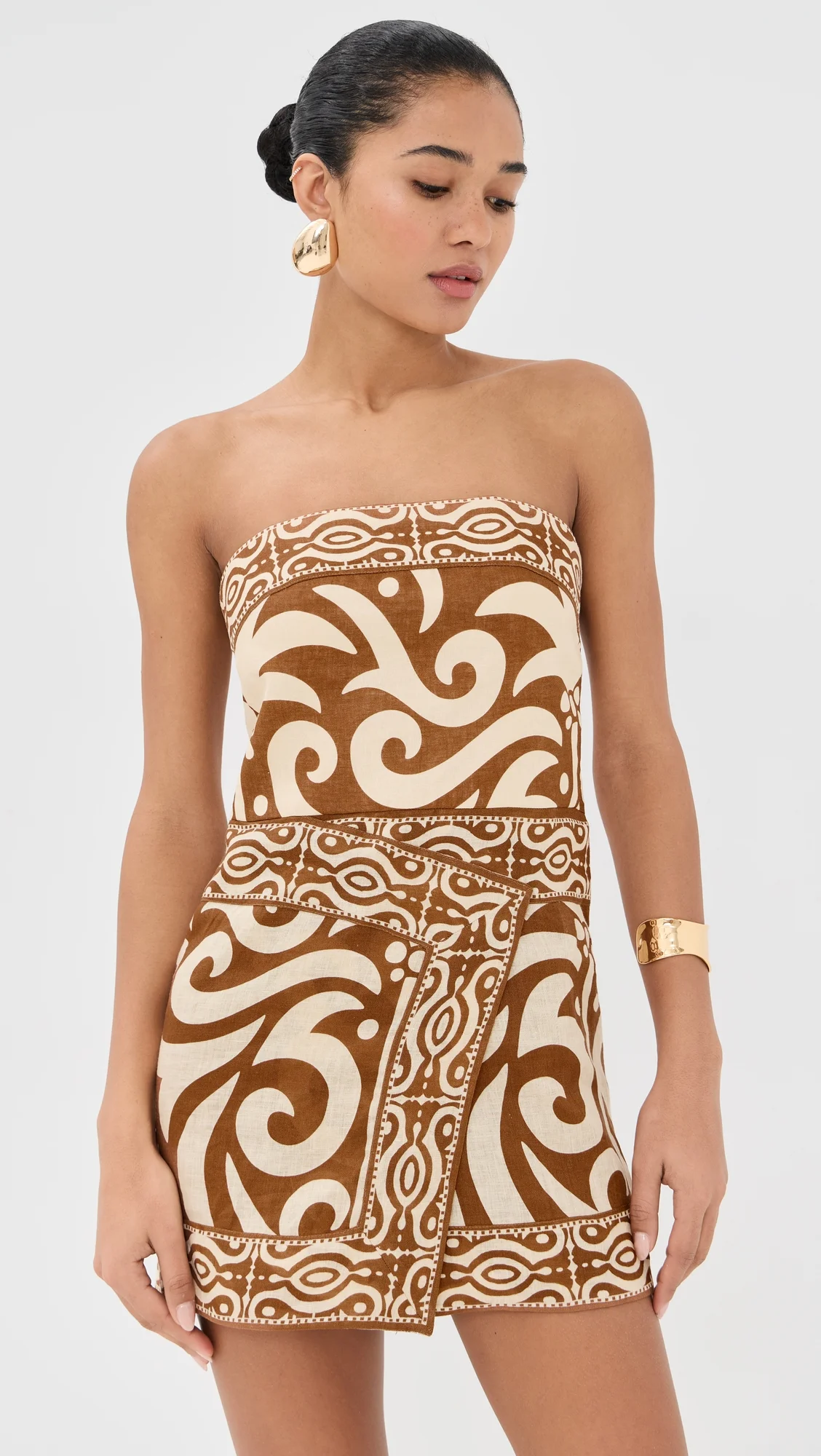 - Fabric: Lightweight, non-stretch linen weave - Wave print - Smocking at back - Mini length - Strapless - Sleeveless - Pullover design, no closure - Shell: 100% linen - Lined bodice, unlined skirt - Lining: 100% viscose - Dry clean - Imported, Colombia Style #JORTI30567