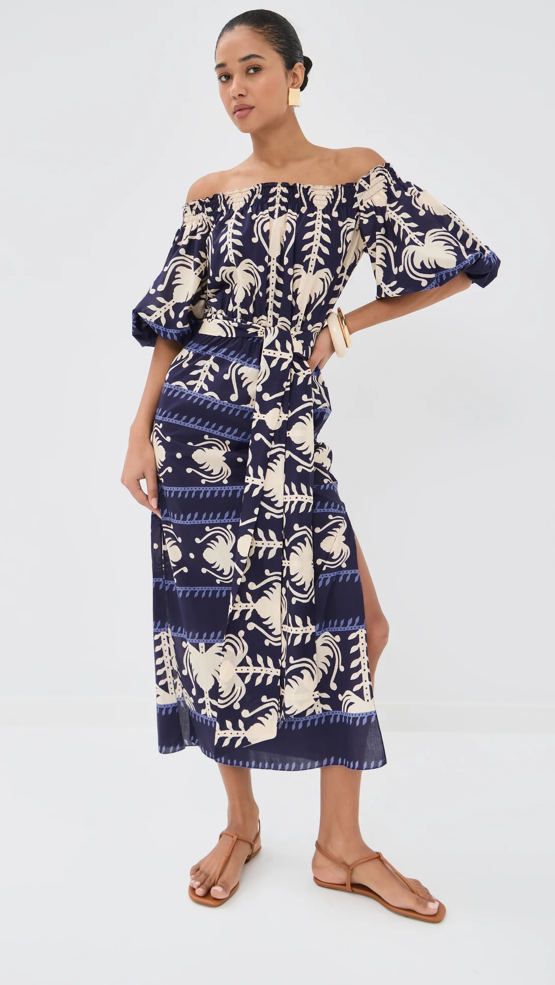 - Fabric: Lightweight, non-stretch poplin - Palm leaf print - Smocked elastic topline - Midi length - Off-shoulder neckline - Short puff sleeves - Tie self-belt - Shell: 100% viscose - Dry clean - Imported, Colombia Style #JORTI30590