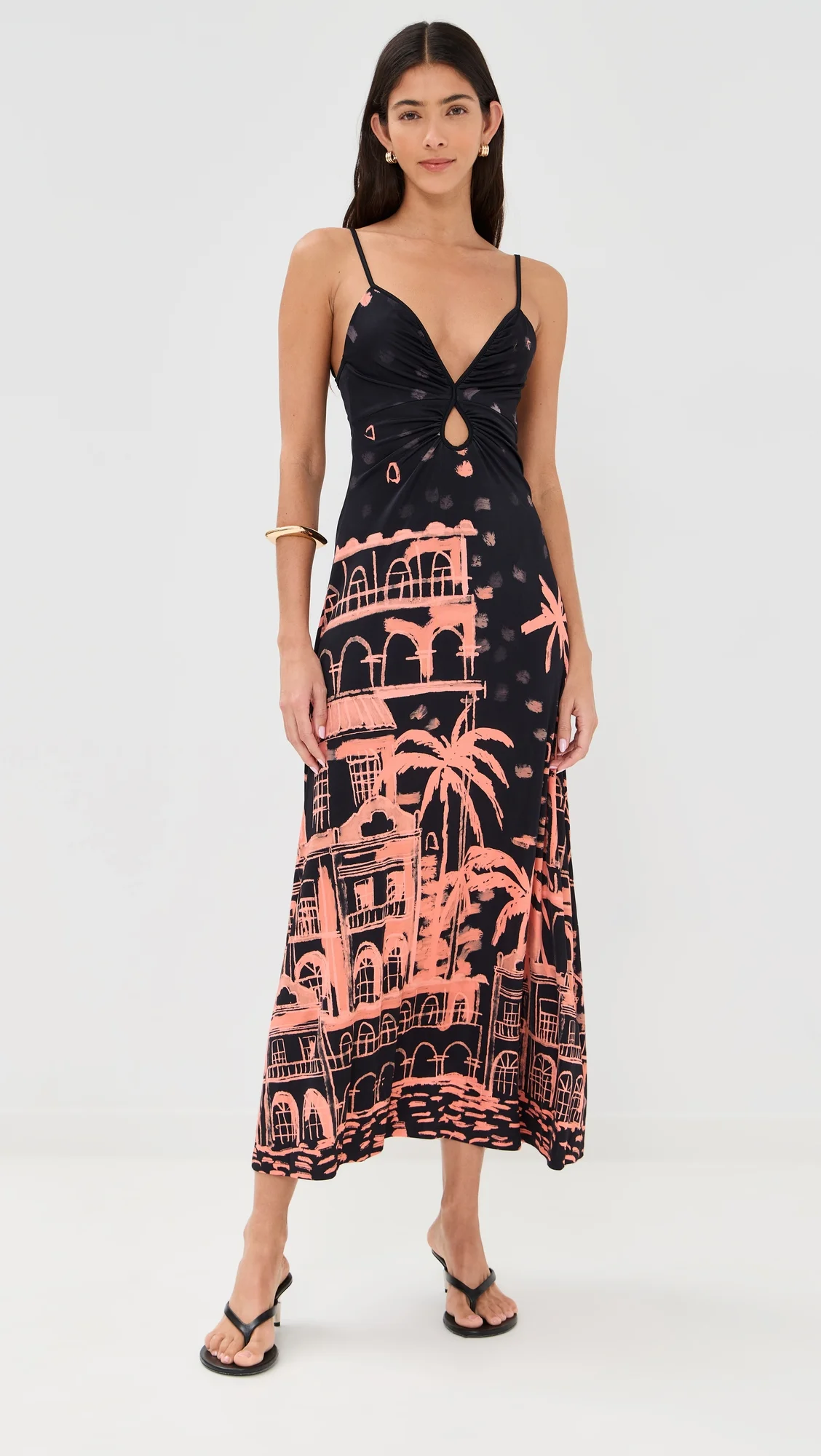 - Fabric: Mid-weight slinky jersey with stretch - Cutout at front - Landscape print - Midi length - V neck - Adjustable shoulder straps - Pullover design, no closure - Shell: 96% viscose/4% elastane - Unlined - Dry clean - Imported, Colombia Style #JORTI30608
