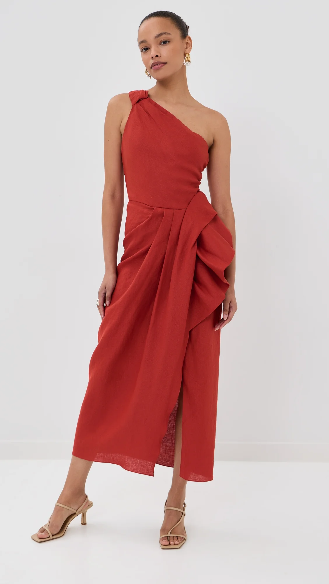 - Fabric: Lightweight, non-stretch linen weave - Draped and ruched waist - Knotted detail at shoulder - Non slip rubber binding at neckline - Split hem at side - Midi length - One-shoulder neckline - Sleeveless - Buttons and hidden zip at back - Covered slant hip pocket - Shell: 100% linen - Lined bodice, unlined skirt - Wash cold - Imported, Colombia Style #JORTI30611 Size & Fit Model measurements: Size 0: Alexis (5'8") usually wears size 0-2 Measurements from size 2 Length: 53.25in / 135.0cm, from shoulder to front hem