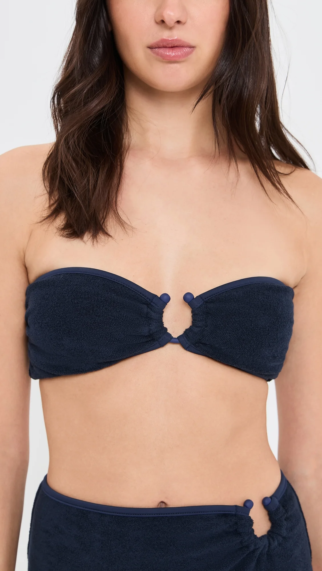 - Terry cloth fabric and tonal trim - U-ring detail - Bikini clasp - Lined cups - Shell: 100% cotton - Lined - Dry clean - Imported, Colombia - Bottoms sold separately Style #JORTI30558