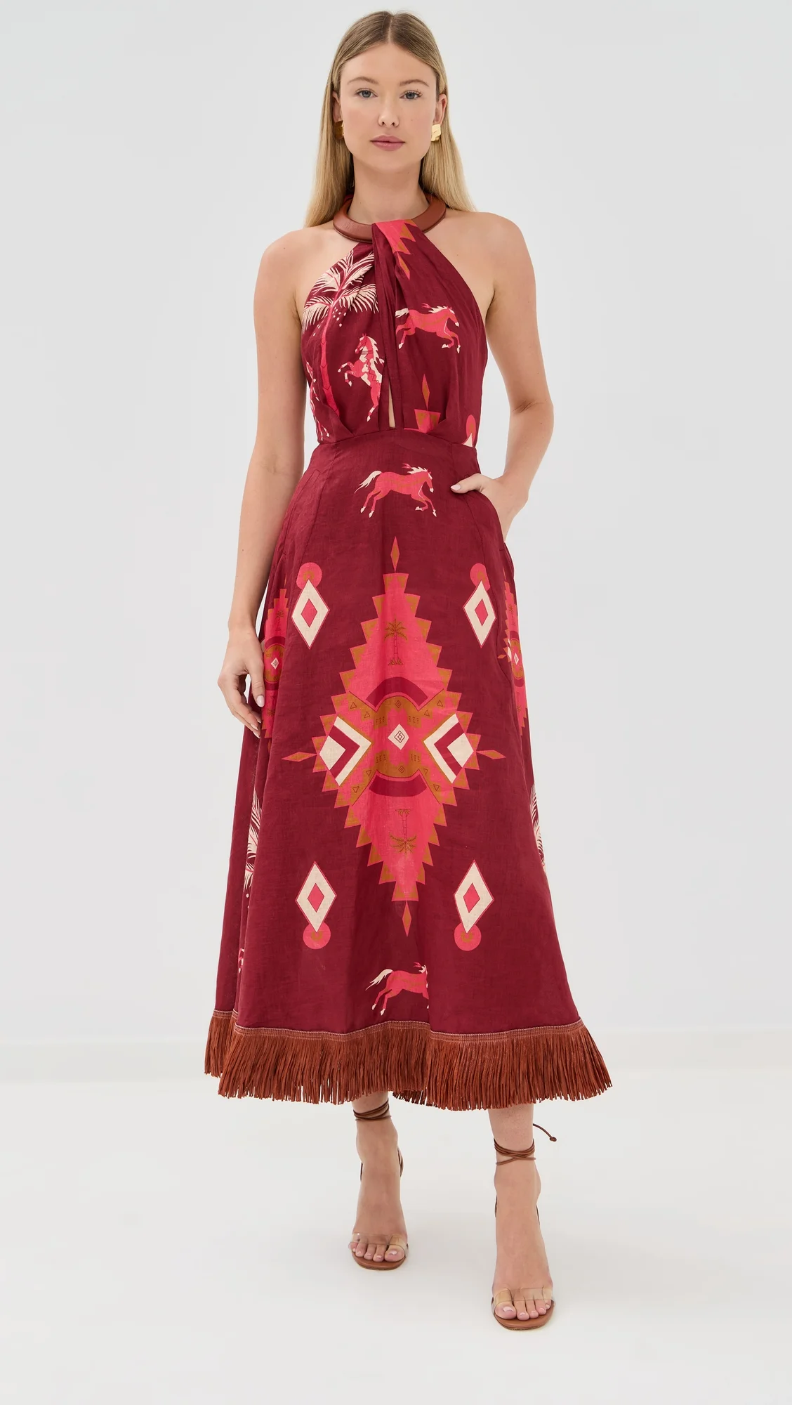 - Fabric: Mid-weight, non-stretch linen weave - Geometric pattern - Fringe at hem - Maxi length - Halter neckline - Sleeveless - Snap and hidden zip at back - Patch front pockets - Shell: 100% linen - Lined - Lining: 100% viscose - Dry clean - Imported, Colombia Style #JORTI30517