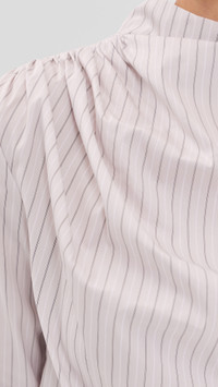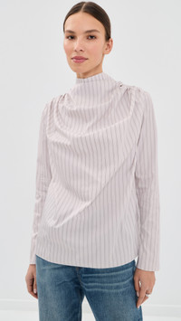 - Fabric: Lightweight, non-stretch poplin - Striped pattern - Mock neck - Long sleeves - Buttons at back - Shell: 86% cotton/14% polyester - Wash cold - Made in the USA Style #KALME30000 Size & Fit Model measurements: Size 2: Anna (6'0") usually wears size 0-2 Measurements from size 2 Length: 26.5in / 67.0cm, from shoulder