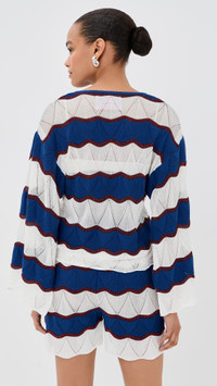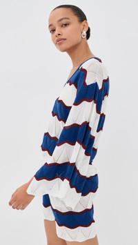 - Fabric: Lightweight stretch knit - Wave pattern - Slits at sleeves - V neck - Long sleeves - Shell: 50% cotton/46% viscose/4% metallic - Dry clean - Made in Italy Style #LADOU31160 Size & Fit Model measurements: Size XS: Alexis (5'8") usually wears size XS-S Measurements from size S Length: 19in / 48.0cm, from shoulder