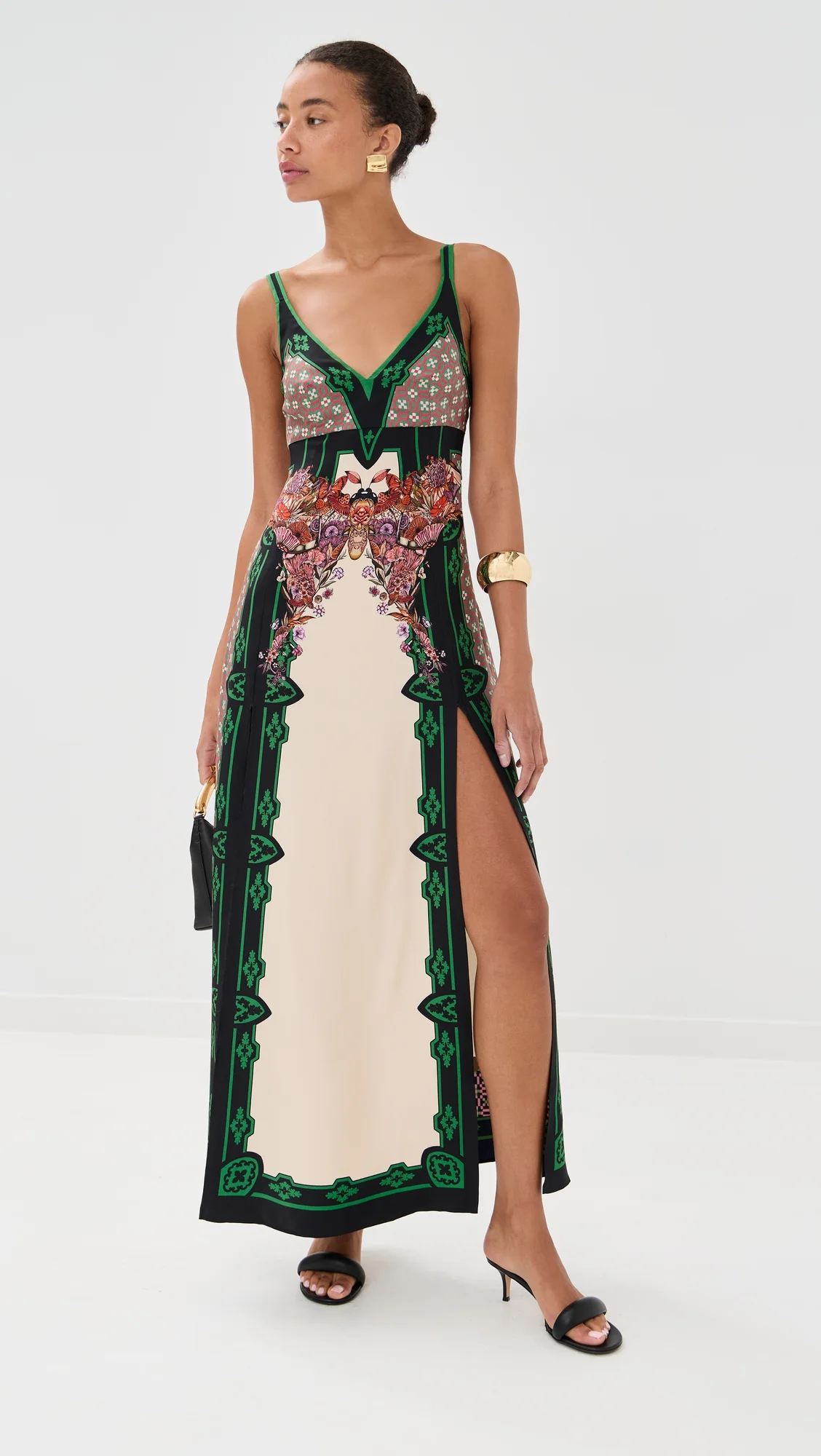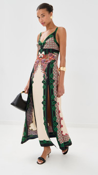 - Fabric: Lightweight, non-stretch silk charmeuse - Floral pattern - Slits at front - Maxi length - V neck - Adjustable shoulder straps - Hidden zip at side - Shell: 100% silk - Unlined - Dry clean - Made in Italy Style #LADOU31115 Size & Fit Model measurements: Size XS: Drew (5'8") usually wears size XS-S Measurements from size S Length: 53.25in / 135.0cm, from shoulder