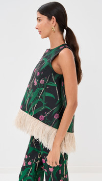 - Fabric: Mid-weight, non-stretch jacquard - Ostrich feather trim at hem - Curved high-low hem - Metallic threading - Floral pattern - Crew neck - Sleeveless - Hidden zip at back - Shell: 50% polyester/26% silk/19% viscose/5% metallic - Lined - Lining: 100% polyester - Dry clean - Made in Italy Style #LADOU31128 Size & Fit Model measurements: Size XS: Brittany (5'9.5") usually wears size XS Measurements from size XS Length: 20.5in / 52.0cm, from shoulder